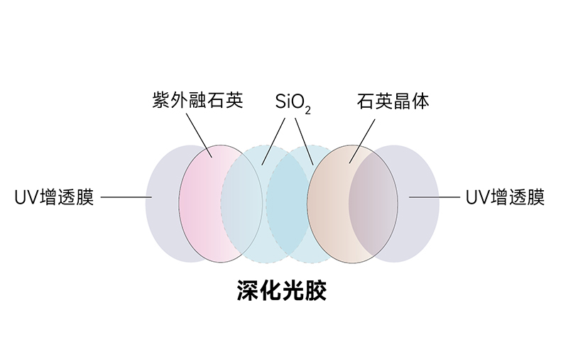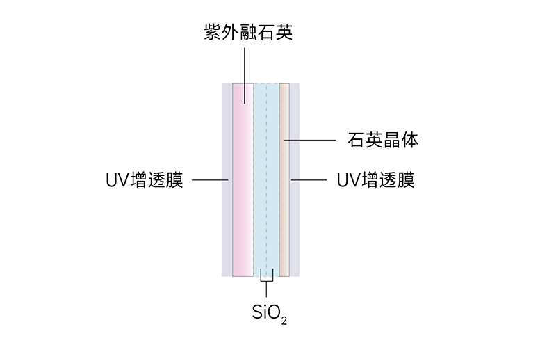 利用光膠在第一層和第二層二氧化硅之間形成一層二氧化硅膜,實現(xiàn)了將紫外融石英和石英晶體相連的目的。該波片的結(jié)構(gòu)排列為紫外增透膜/紫外融石英/二氧化硅膜/石英晶體/紫外增透膜。光膠的運(yùn)用使得紫外融石英、第一層二氧化硅、第二層二氧化硅和石英晶體之間形成了堅固的鍵合,從而能夠承受更高功率的紫外激光。